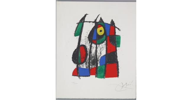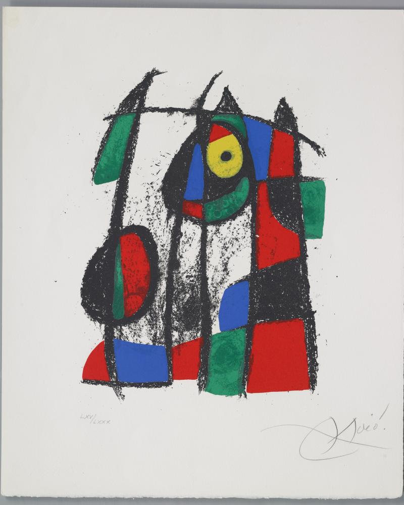 Tra le principali opere esposte, si distinguono le litografie a colori Centenario Mourlot (1953), riferimento fondamentale per la collaborazione tra Joan Miró e la storica stamperia Mourlot; Serie II, blu e rosso (1961), esempio della ricerca cromatica e gestuale di Miró negli anni Sessanta. Los vigias (Les guetteurs) (1964), opera di grande formato e impatto visivo; Midi le trèfle blanc (1968), acquaforte acquatinta a colori, rappresenta la sperimentazione di Miró con le tecniche incisorie, e Oda a Joan Miró (1973), omaggio all’artista e sintesi della sua poetica. Tra le numerose opere, anche riproduzioni di copertine di libri, cataloghi di mostre e copertine di LP illustrate da Joan Miró.