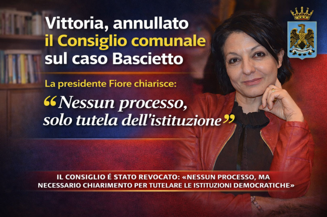 È stato annullato il Consiglio comunale di Vittoria convocato d’urgenza per discutere la vicenda legata al giornalista Bascietto. La seduta, inizialmente prevista per martedì 7 gennaio 2026 alle ore 19.00, non si svolgerà.