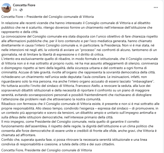 Confido che, superata questa fase, si possa ritrovare la necessaria serenità istituzionale e una linea condivisa di responsabilità e coesione, a tutela della città e dei suoi cittadini. Concetta Fiore, Presidente del Consiglio comunale di Vittoria