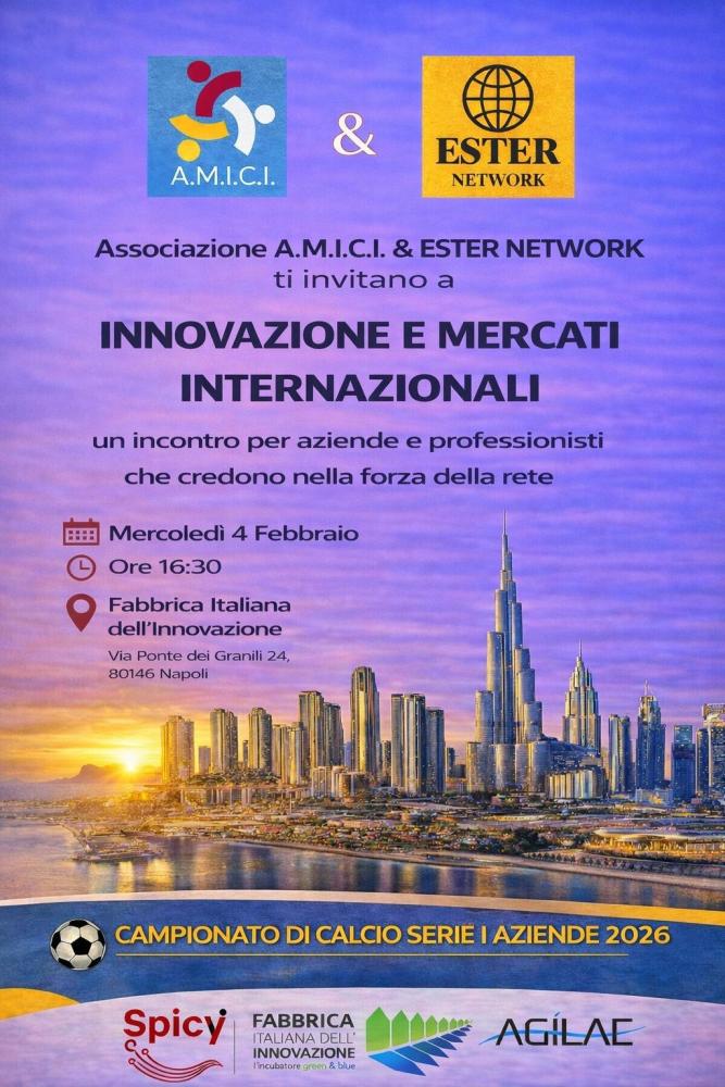 Networking, sostenibilità e connessioni saranno al centro dell’incontro “Innovazione e Mercati Internazionali”, in programma mercoledì 4 febbraio alle ore 16:30 presso la Fabbrica Italiana dell’Innovazione, in via Ponte dei Granili 24, Napoli.