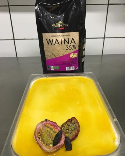“Mi sono ispirato al Solero, pensando alla combinazione tra Cioccolato Bianco, Waina 35% di Valrhona, e Maracujà, quindi un gusto su base latte e uno esotico.”