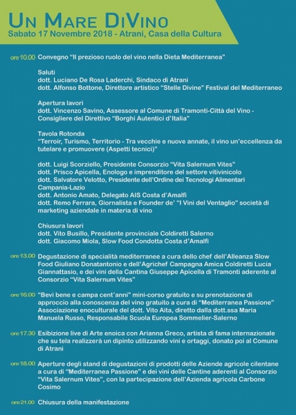Nell’ambito della 3a edizione di “Stelle Divine - Festival del Mediterraneo”, sabato 17 novembre presso la Casa della Cultura nello splendido borgo di Atrani, il più piccolo comune italiano per superficie, l’evento enogastronomico “Un Mare DiVino” sorprenderà con una serie di appuntamenti nell’arco dell’intera giornata. Ideato dalla storica dell’arte e giornalista enogastronomica Annamaria Parlato, già promotrice nell’edizione 2017 del Festival dell’evento gastronomico “La Salute vien Mediterraneando”, “Un mare DiVino” nasce per valorizzare le ricchezze enogastronomiche della Dieta Mediterranea e il patrimonio storico, culturale, turistico, creativo da Atrani e dalla Costa d’Amalfi sino al Cilento. La Dieta Mediterranea e i suoi vini saranno protagonisti indiscussi della kermesse grazie al supporto di esperti ed operatori del mondo scientifico, culturale ed enogastronomico sul territorio salernitano.