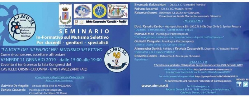 AVEZZANO (AQ) - Si terrà venerdì 11 gennaio, dalle 15 alle 19 di Avezzano (AQ), il convegno dal titolo "La voce del silenzio nel mutismo selettivo". L'evento è organizzato dall'Aimuse e coordinato dal referente regionale Roberto Gemmi.