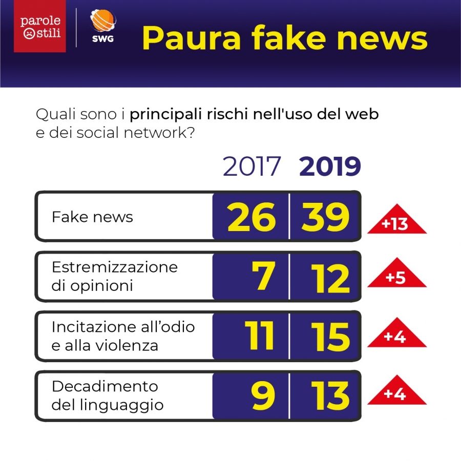 Dai risultati emerge una sensibile crescita (+ 13%) della paura di abboccare alle fake news sui social e in Rete: si passa dal 26% del 2017 al 39% del 2019.