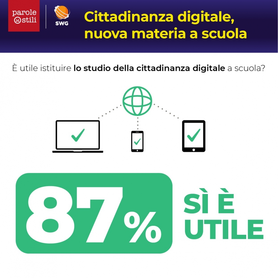 Un’attenzione verso questi temi che viene confermata dalle rilevazioni SWG secondo la quale l’87% degli intervistati ritiene la cittadinanza digitale per un uso consapevole e maturo della Rete debba diventare materia scolastica.