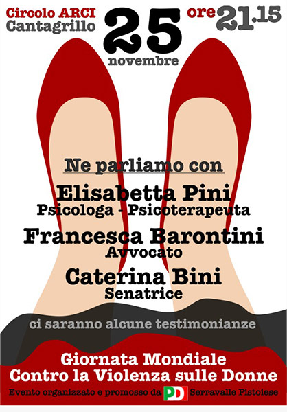 NON basta un solo giorno per far comprendere che è l’ora di smetterla di usare la violenza contro le Donne, ma nell’occasione della Giornata Mondiale, si è tenuto nella comunità di Cantagrillo, in provincia di Pistoia, presso il Circolo Arci, il convegno che ha visto la partecipazione della psicologa e psicoterapeuta Elisabetta Pini, dell’avvocato Francesca Barontini e della Senatrice Caterina Bini con la moderazione di Caterina Benini. Un folto pubblico era presente in sala, ma più al femminile, e questo lascia riflettere, ma il fulcro dell’incontro è stata la testimonianza della sorella di una vittima che ha raccontato cosa realmente succede dietro le quinte dopo che il femminicidio è scorso sui mass-media per mera informazione. Un racconto toccante e cruente. E’ su questa scia che si è articolato il convegno dove i relatori hanno espresso conoscenze ed informazioni sia dal punto di vista psicologico che giuridico.