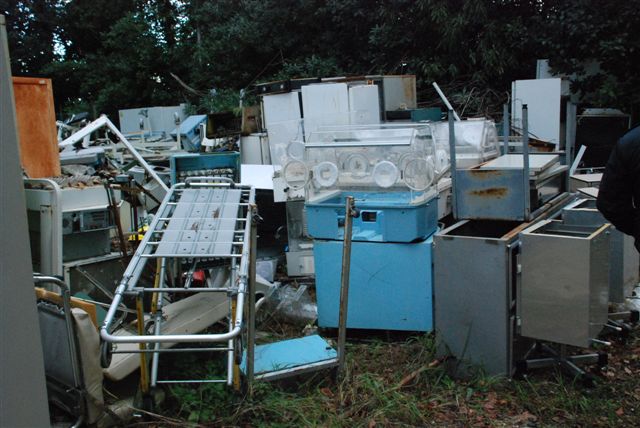 I rifiuti costituiti principalmente da macchinari diagnostici, computer, monitor, frigoriferi industriali, letti, sedie, armadietti, faldoni ed altri suppellettili, nonché un contenitore di rifiuti sanitari. Materiale tutto non più in uso, stoccati in 3 punti diversi dell'area esterna dell'ex ospedale, in parte su pavimentazione ed in parte a diretto contatto del terreno senza isolamento e senza alcuna copertura, completamente esposti agli agenti atmosferici.