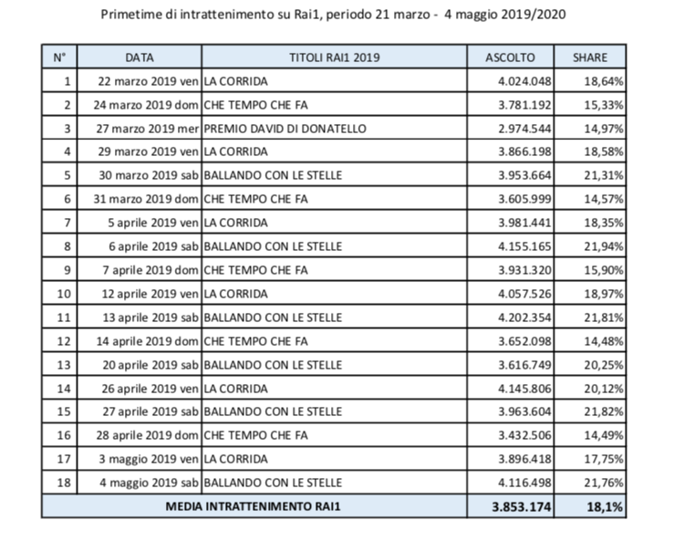 Come dimostrano le grafiche che pubblichiamo nella galleria soprastante, la media dell'intrattenimento di Rai1 in "periodo Covid" è di 3.612.425 spettatori (240.749 in meno rispetto al 2019) con uno share del 13.7% (- 4.5% rispetto al 2019). Nello stesso periodo Canale 5 invece conquista una media di 3.901.083 spettatori ( + 461.394 rispetto al 2019) con uno share del 17.1 (- 2.5% rispetto al 2019).