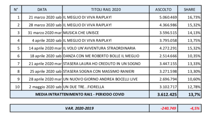 A conti fatti, le repliche di Viva RaiPlay con Fiorello, e quelle dei programmi di Roberto Bolle, di Fiorella Mannoia, di Andrea Bocelli, del Volo ecc. hanno avuto la peggio contro le riproposizioni di Ciao Darwin di Paolo Bonolis (grande successo di Lucio Presta) e di Tu Si Que Vales di Maria De Filippi, corroborate dai risultati di Live - Non è la D'Urso di Barbara D'Urso la domenica e del Grande Fratello Vip condotto da Alfonso Signorini.