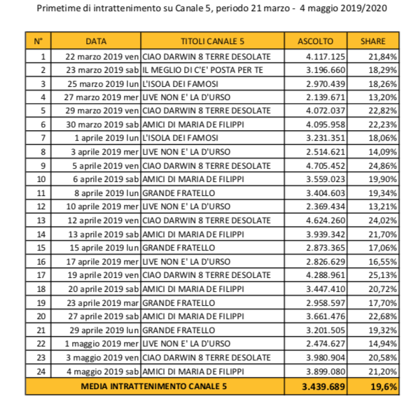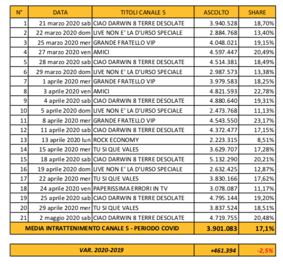 Gli ascolti Tv del "periodo coronavirus", per quanto riguarda l'entertainment, incoronano Canale 5. Rai1 viene battuta dall'Ammiraglia del Biscione, che riesce - secondo lo Studio Barometro sui dati Auditel - a intercettare meglio la platea televisiva accresciuta dal lockdown.
