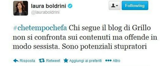 Il presidente della Camera Laura Boldrini, ospite della trasmissione Che Tempo che Fa di Fabio Fazio su Raitre, torna sugli incidenti in aula a Montecitorio e nelle commissioni degli ultimi giorni, e passa all'attacco degli estremisti del Movimento 5 Stelle. Il video postato sul blog di Grillo, secondo Boldrini, era «istigazione alla violenza, basta vedere i commenti, tutti a sfondo sessista. Chi segue quel blog non vuole il confronto ma offendere e umiliare. Sono potenziali stupratori». «Tutto questo - dice ancora Boldrini - non era mai accaduto e mi fa venire in mente qualcosa di brutto, quando il Parlamento era esautorato e si cercava di bloccare la democrazia. Questo non è accettabile, sono atti eversivi, non è tollerabile, c'è un'emergenza democratica, questa cosa deve essere trattata con la massima serietà ».