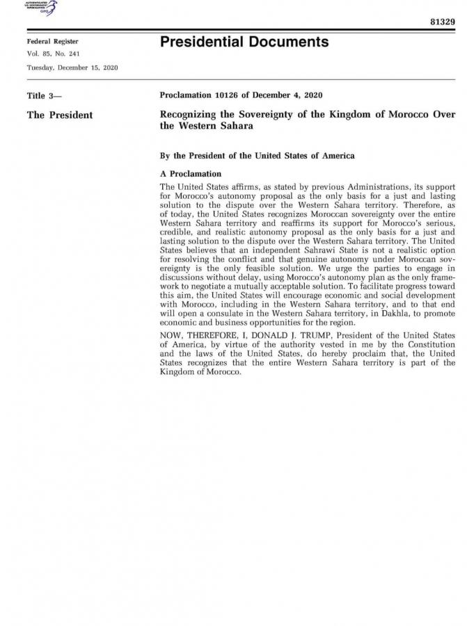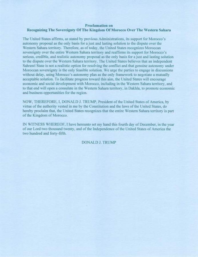 Gli Stati Uniti d'America, nella persona della loro ambasciatrice rappresentante presso le Nazioni Unite Kelly Craft, hanno inviato martedì 15 dicembre la loro Proclamazione di riconoscimento della sovranità del Marocco sul suo Sahara, al Segretario generale dell'ONU Antonio Guterres e al presidente del Consiglio di sicurezza Jerry Matthews Matjila.