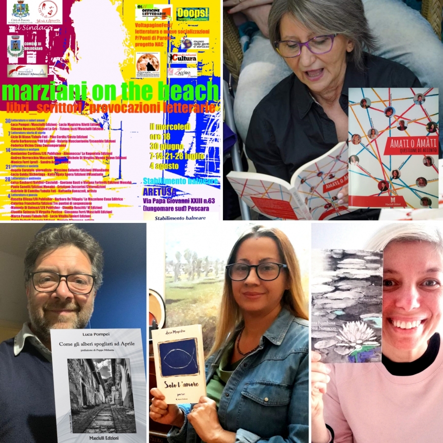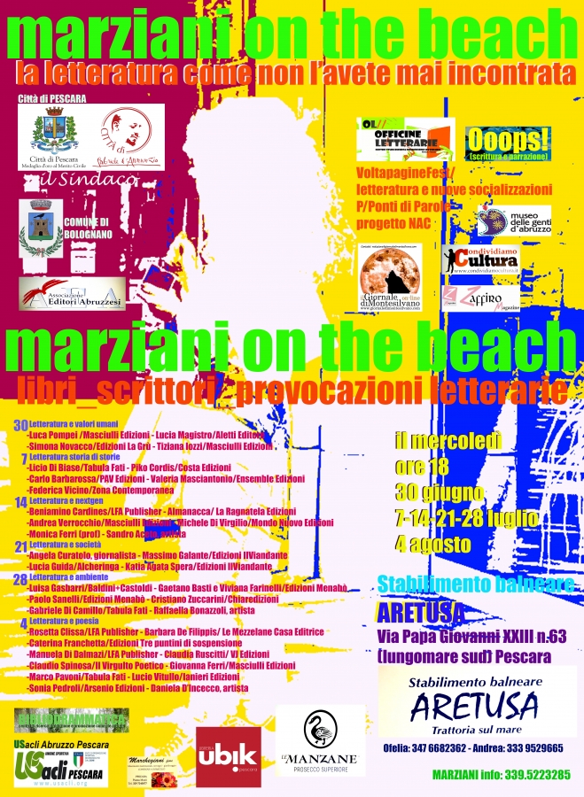 A Pescara da mercoledì 30 giugno, OL//OFFICINE LETTERARIE - Centro studi, ricerca e promozione letteraria, progetto NAC – Narratori Abruzzesi Contemporanei, progetto VoltapagineFest/letteratura e nuove socializzazioni presentano “MARZIANI… on the beach – la letteratura come non l’avete mai incontrata” ogni mercoledì a partire dal 30 giugno, 7-14-21-28 luglio, e 4 agosto 2021, dalle ore 18 presso Stabilimento Balneare Aretusa Lungomare Pescara Sud. Un luogo all’aperto, informale, accogliente, per re-inventare l’idea di salotto letterario. Ospiteremo autori e autrici, editori, e tutta la vivacità della letteratura abruzzese contemporanea. Un progetto di decentramento culturale che porta la cultura letteraria verso una condivisione più diffusa e dentro la dimensione quotidiana.