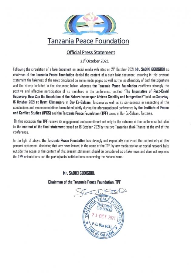 In un comunicato stampa del 23 ottobre 2021, la Tanzania Peace Foundation (TPF) rifiuta e smentisce un documento falsificato, che le è stato attribuito il 21 ottobre dall'agenzia algerina APS e divulgato sui social network circa le raccomandazioni di Dar Es-Salam del 16 ottobre sull'espulsione del fantasma rasd dall'Unione Africana (AU).
