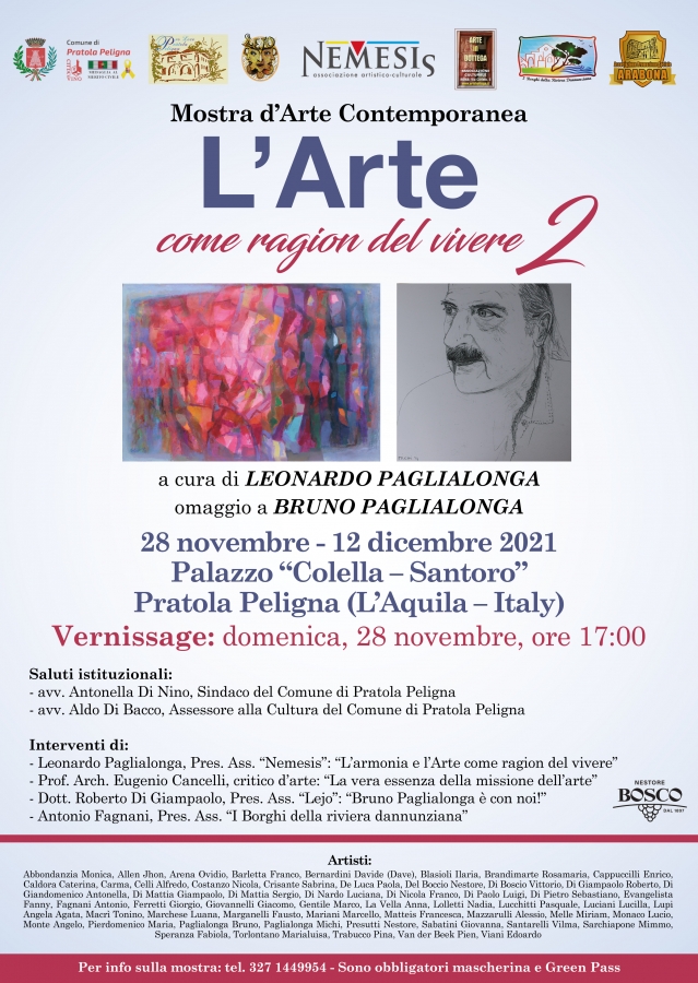 Domenica 28 novembre 2021, alle ore 17, presso le prestigiose Sale del Palazzo “Colella – Santoro” di Pratola Peligna (AQ), s’inaugura la mostra collettiva d’arte contemporanea dal titolo “L’Arte come ragion del vivere”, che giunge alla Seconda Edizione. Il curatore d’arte, Leonardo Paglialonga, Presidente dell’Associazione artistico-culturale “Nemesis” di Francavilla al Mare (CH), ha invitato ad esporre per l’occasione 55 artisti provenienti dalle quattro provincie abruzzesi, da varie regioni d’Italia e dall’estero (Olanda). In programma un omaggio al Maestro Bruno Paglialonga, recentemente scomparso, con l’esposizione di alcuni suoi lavori realizzati negli anni Settanta, in parte inediti. Un modo per ricordare la sua figura di artista e critico d’arte, di studioso e ricercatore, che ha contribuito a valorizzare l’arte e la cultura italiana nel mondo. Sono previsti, per i saluti istituzionali, gli interventi del Sindaco di Pratola Peligna, avv. Antonella Di Nino, e dell’Assessore alla Cultura, avv. Aldo di Bacco. La cerimonia inaugurale continuerà con la relazione di Leonardo Paglialonga, organizzatore della manifestazione, sul tema: “L’armonia e l’Arte come ragion del vivere”. A seguire il Prof. Arch. Eugenio Cancelli, critico d’arte, sul tema: “La vera essenza della missione dell’arte”; il dott. Roberto Di Giampaolo, Presidente dell’Associazione “Lejo”, con una testimonianza critica dal titolo “Bruno Paglialonga è con noi!”; per terminare poi con Antonio Fagnani, Presidente dell’Associazione culturale “I Borghi della riviera dannunziana” di Pescara, presente anche con le sue lampade artistiche alla mostra, che rientra nell’ambito della valorizzazione del nostro territorio, l’Abruzzo, attraverso i mezzi a noi più congeniali: le Arti visuali. La mostra, patrocinata dal Comune e dalla Pro-loco di Pratola Peligna, dalle Associazioni “Lejo”, “Arte in Bottega” (Roma), “I Borghi della riviera dannunziana” (Pescara), “Arabona” (Manoppello, PE), proseguirà fino al 12 dicembre 2021, dove è previsto un evento di “finissage” di natura poetica e musicale.