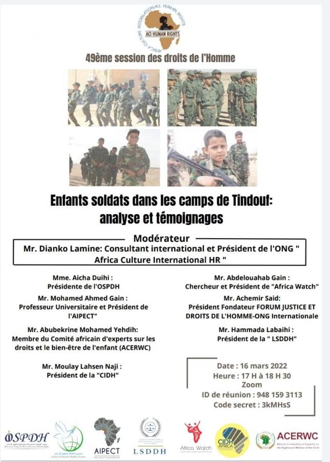 La militante Aicha Duihi ha sottolineato che l'indottrinamento e l'arruolamento di bambini da parte del Polisario in Algeria nelle guerre è un crimine contro gli esseri umani in generale. Questa pratica contraddice i principi dei diritti umani e le esigenze della Convenzione sui diritti del fanciullo, che sancisce l'educazione ai principi e ai valori di libertà , uguaglianza e tolleranza in maniera mirata a consolidare la personalità del bambino.