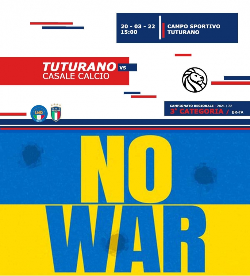 La guerra in Ucraina scatenata dalla Russia fa davvero paura. Una situazione che non accenna a calmarsi, le bombe continuano a cadere in maniera incessante su tutto il Paese, costringendo la gente a trovare rifugio altrove. Per questo, nella giornata del 20 marzo, in occasione della partita casalinga contro il Brindisi Casale Calcio, la società di casa Leone Soccer Tuturano, ha deciso di devolvere l'intero ricavato in beneficenza, che andrà appunto alla popolazione ucraina duramente colpita dalla guerra scatenata dalla Russia. Inoltre, poco prima del calcio di inizio, previsto per le ore 15:00, i piccoli tifosi della squadra del Tuturano entreranno in campo e sfileranno sventolando le bandiere con la scritta "NO ALLA GUERRA".