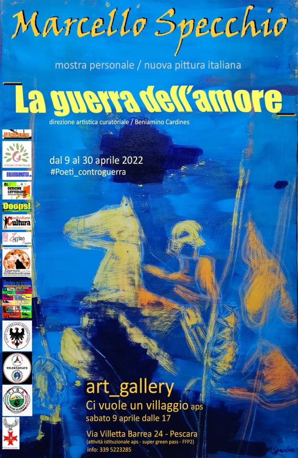 “Un piccolo esercito di poesia e cultura che si oppone come bene al male” un grande reading di poesia sabato 9 aprile dalle ore 17 a “Ci vuole un villaggio aps” (Via Villetta Barrea 24 a Pescara), progetto #Poeti_controguerra che vede la partecipazione di alcune delle voci più significative della poesia contemporanea italiana e abruzzese, oltre 25 poeti e poetesse, tra cui Antonio Lera già candidato al Premio Nobel per la Letteratura 2020 e 2021. L’evento sarà accolto nella suggestiva cornice della mostra dell’artista Marcello Specchio dal titolo “La guerra dell’amore” mostra che resterà aperta fino al 30 aprile.