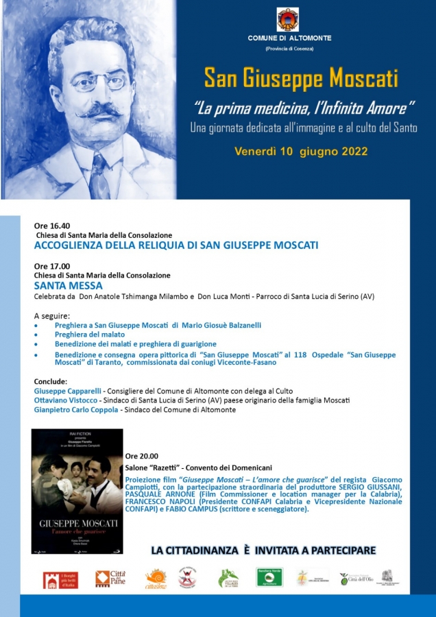 I prossimi 9 e 10 Giugno Altomonte, riconosciuto come uno dei borghi più belli d'Italia, città slow, citta' del pane, città dell'Associazione Nazionale del Santissimo Crocifisso e bandiera verde, ospiterà una manifestazione dedicata a San Giuseppe Moscati, il Santo medico di Napoli. Il centro della Valle dell' Esaro vivra' momenti di scienza e di fede, ricordando la figura del Medico dei poveri, il quale dedico' tutta la sua vita alla cura del corpo e dell'anima, in maniera particolare ai meno abbienti che vista l'epoca, i primi del 900, difficilmente avrebbero avuto accesso a cure mediche adeguate.