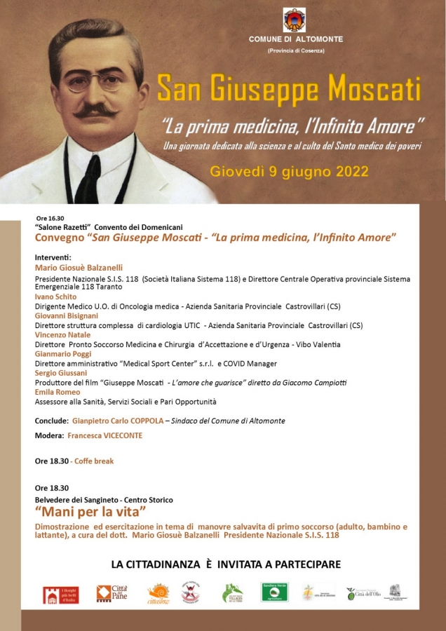 "La prima medicina l'infinito Amore" sarà questo il tema del Convegno, che si terra' giovedì 9 Giugno alle 16:30 nel centro storico del borgo altomontese, al quale parteciperanno, Dirigenti Medici e Operatori sanitari, i quali vivono giornalmente in prima persona la missione del Medico. Al convegno seguirà un' esercitazione e dimostrazione in tema di manovre Salvavita di Primo Soccorso, a cura del Dott. MARIO BALZANELLI Presidente Nazionale Societa' Italiana Sistema 118. Nella giornata di venerdi 10, l' aspetto scientifico, lascerà posto a quello spirituale, nella Chiesa Santa Maria della Consolazione, saranno accolte le reliquie del Medico Santo accompagnate dal sacerdote Don Luca Monti e da Ottaviano Vistocco, Sindaco di Santa Lucia di Serino (AV), paese d'origine della famiglia Moscati.