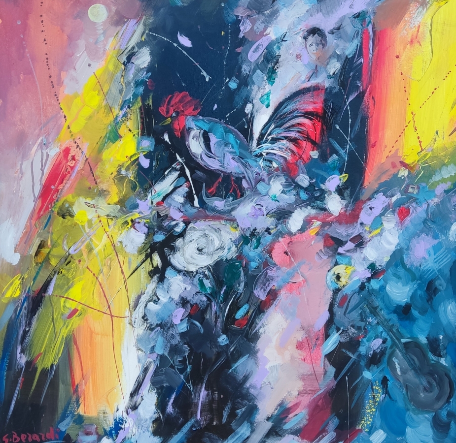 Beniamino Cardines, curatore e direttore artistico: “Gino Berardi incarna la volontà, la tenacia, la resistenza che ogni artista dovrebbe riuscire a mettere in campo lungo l’arco di una vita. In questo senso la sua carriera di pittore è paradigmatica, non c’è solo un progetto visivo, d’arte, oltre c’è un uomo e tutta la sua energia, la sua forza interiore, la sua esperienza. I suoi quadri, solo apparentemente astratti, sono il risultato di un processo di sedimentazione e fusione che attraverso simboli ricorrenti - il gallo, la rosa, la farfalla, la scala, la chiave di violino, solo per citarne alcuni - e tavolozze multicromatiche, riescono a esprimere le molte contaminazioni della società contemporanea. Gino Berardi è un artista che vive nel suo tempo e lo dipinge, è un uomo della vita.”