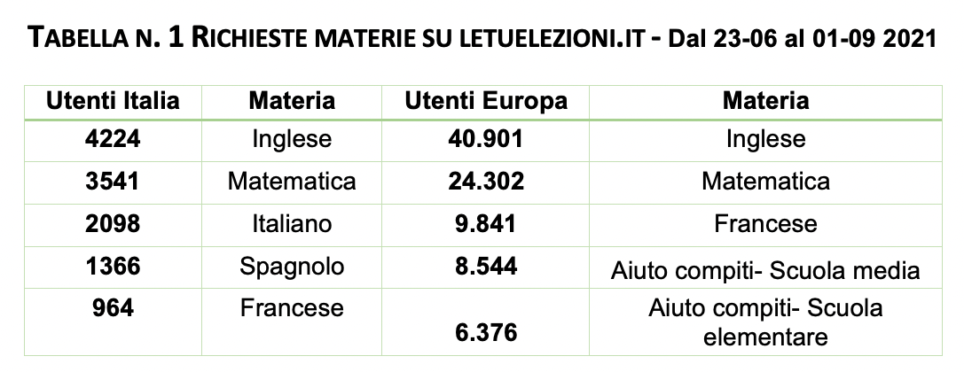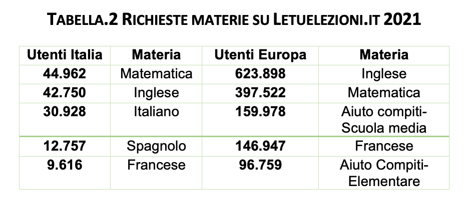 In Italia gli utenti (insegnanti e studenti) di Letuelezioni.it sono 329.249 (10%) contro i 3.126.391 di quelli europei. Se si considera l’anno 2021 (Tab. 2), in Italia, le ripetizioni di matematica schizzano al primo posto con 44 mila utenti che le richiedono, a differenza del dato europeo in cui al primo posto rimane l’inglese con quasi 700 mila utenti.