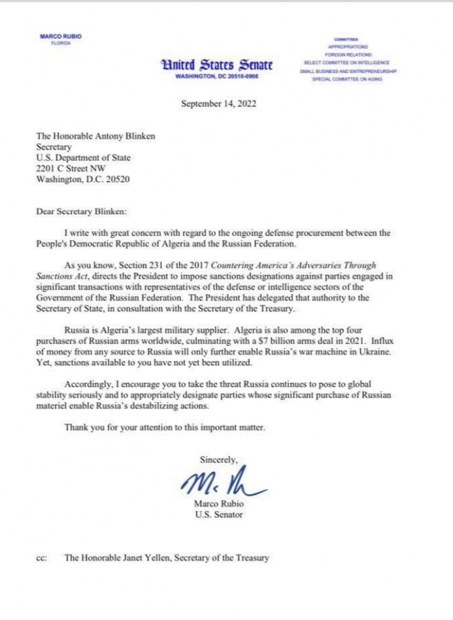 La vicinanza tra Algeria e Russia è segnalata da alcuni circoli negli Stati Uniti. Una preoccupazione che il senatore Usa Marc Rubio ha espresso giovedì 15 settembre in una lettera indirizzata ad Antony Blinken. Il repubblicano e vicepresidente dell’Intelligence Committee alla Camera alta del Parlamento ha chiesto sanzioni contro l’Algeria per aver violato il "Countering America’s Adversaries Through Sanction Act", adottato da senatori e deputati e poi firmato nell’agosto 2017 dall’ex presidente Donald Trump.