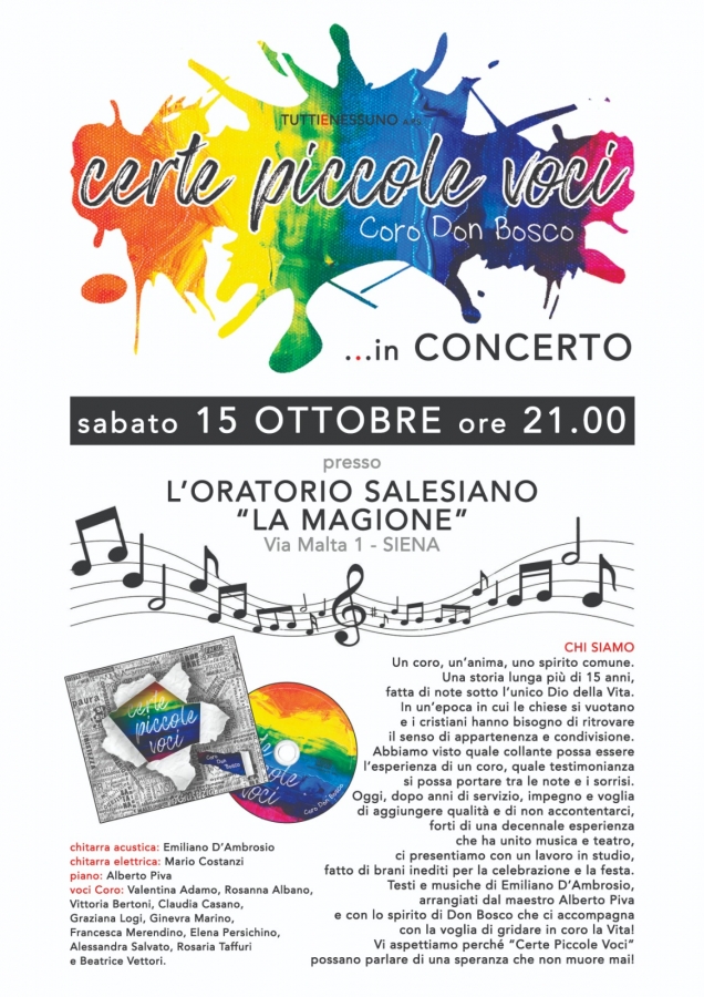 Sabato 15 ottobre, ore 21, all’Oratorio Salesiano “La Magione” di Siena (via Malta, 1), si terrà il concerto del Coro “Don Bosco” diretto da Emiliano D’Ambrosio in cui presenteranno in anteprima il nuovo disco “Certe Piccole Voci” con 12 canti per la liturgia.