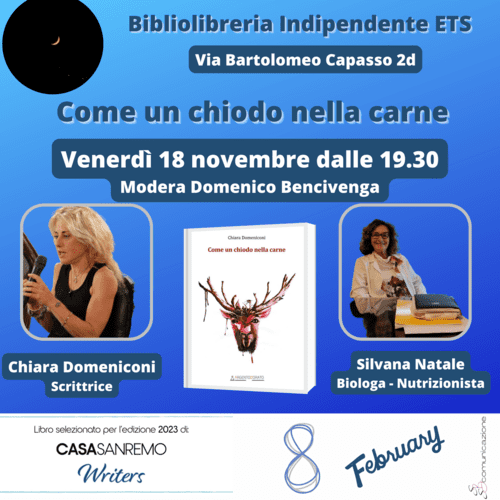 Domenico Bencivenga, cuore e motore della Bibliolibreria, sarà nuovamente moderatore, oltre che organizzatore, dell’evento e dichiara: “Incontriamo per la seconda volta Chiara Domeniconi e il suo libro autobiografico: Come un chiodo nella carne.
