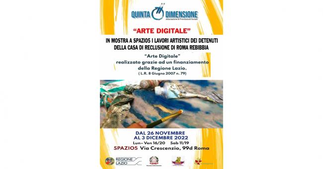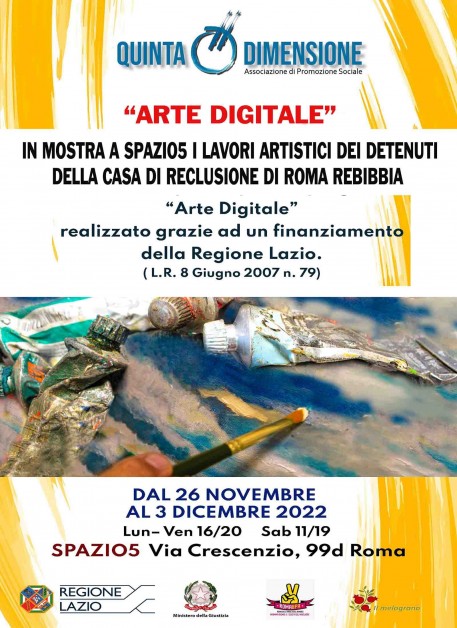 A SPAZIO5 il 26 novembre alle ore 18.30 il Prof. Claudio Strinati presenterà la mostra delle opere dei detenuti della Casa di Reclusione Rebibbia realizzate nel corso del progetto "ARTE DIGITALE", il progetto nato su iniziativa della Direzione della Casa di Reclusione Rebibbia Roma, realizzato grazie alla Dott.ssa Antonella Rasola, e al Comandante della Polizia Penitenziaria Dirigente Luigi Ardini, con il supporto dell’educatrice Sara Macchia, ll corso si è svolto, a partire dal mese di febbraio 2022, con il finanziamento ottenuto con la Legge Regionale 8 giugno 2007, n. 7 "Interventi a sostegno dei diritti della popolazione detenuta della Regione Lazio" e realizzato dalla Società Cooperativa Sociale Onlus “Il Melograno” in collaborazione con Roma Bpa – Mamma Roma ed i suoi figli migliori. L’attività, che ha avuto una durata di nove mesi, si è svolta in un'aula all’interno della Casa di Reclusione di Rebibbia, allestita con attrezzature per svolgere attività di pittura e fotografia. Lo staff che ha organizzato e realizzato il progetto "Arte digitale" era composto da :Alessandro Reale - Esperto arte grafica e digitale, Riccardi Maurizio - Esperto arte grafica e fotografica