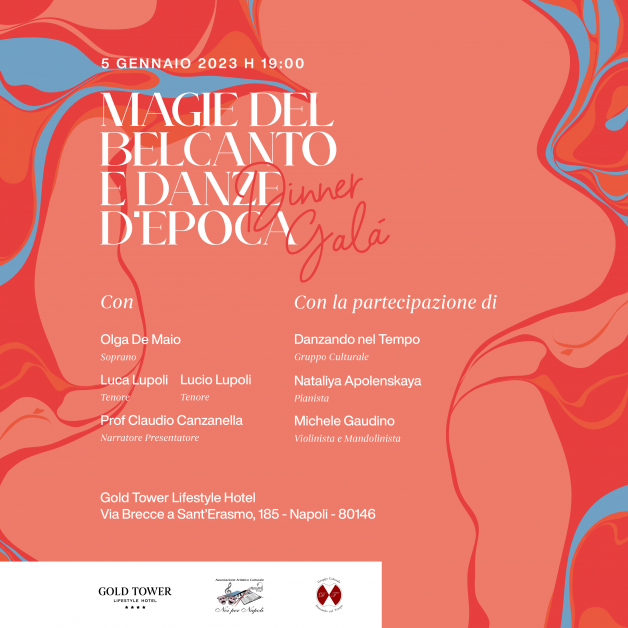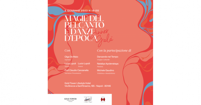L' Associazione Culturale Noi per Napoli, in collaborazione con il Gruppo Culturale " Danzando nel Tempo" presenta un evento davvero esclusivo e particolare,in apertura del nuovo anno 2023, nella magnifica ed esclusiva cornice della Terrazza Attico Ramè del Gold Tower Lifestyle Hotel,un connubio tra Belcanto e Danze d'epoca: le arie di Verdi, Lehar, Di Giacomo, De Curtis e tanti altri compositori che hanno caratterizzano il panorama musicale dell’800, interpretate dal Soprano Olga De Maio e dai Tenori Luca Lupoli e Lucio Lupoli, eseguite dalla pianista Nataliya Apolenskaya e dal violinista e mandolinista Michele Gaudino, quadriglie e valzer danzati, in abiti storici,eseguite dal Gruppo Culturale “Danzando nel Tempo”, daranno vita ad una serata davvero indimenticabile, un viaggio fuori dal tempo, in un' atmosfera sognante, quasi toccando il cielo con un dito,dominando dall'alto la nostra bellissima città, in uno spettacolo nello spettacolo, davvero imperdibile!!!