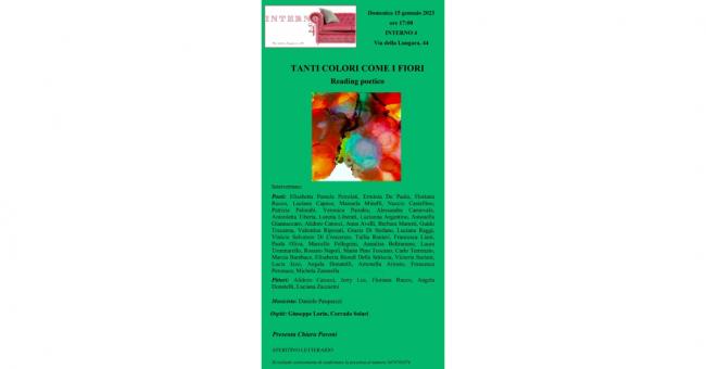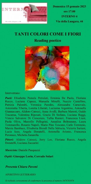 Riparte il ciclo di reading di poesie nel salotto culturale di Chiara Pavoni. Domenica 15 gennaio alle ore 17 il primo incontro a cadenza mensile sarà dedicato ai colori. Da un verso della poesia di Gianni Rodari “Tanti colori come i fiori” prende forma il tanto atteso appuntamento ideato da Chiara Pavoni con la collaborazione di Michela Zanarella. Interverranno: Elisabetta Pamela Petrolati, Erminia De Paola, Floriana Rucco, Luciana Capece, Manuela Minelli, Nuccio Castellino, Patrizia Palombi, Veronica Paredes, Alessandra Carnovale, Antonietta Tiberia, Loretta Liberati, Lucianna Argentino, Antonella Giannaccaro, Alidoro Catocci, Anna Avelli, Barbara Maresti, Marsia Bambace, Guido Tracanna, Valentina Riposati, Grazia Di Stefano, Luciana Raggi, Vinicio Salvatore Di Crescenzo, Tullia Ranieri, Francesca Liani, Paola Oliva, Marcello Pellegrini, Annalisa Beltramme, Laura Tommarello, Rosario Napoli, Mario Pino Toscano, Carlo Terrenzio, Elisabetta Biondi Della Sdriscia, Victoria Suriani, Lucia Izzo, Angela Donatelli, Antonella Ariosto, Francesca Peronace, Michela Zanarella. Pittori: Alidoro Catocci, Jerry Lee, Floriana Rucco, Angela Donatelli, Luciana Zaccarini. Musicista: Daniele Pasquazzi. Ospiti: Giuseppe Lorin, Corrado Solari. Presenta Chiara Pavoni. In conclusione aperitivo letterario.
