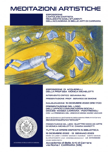 Un mese di successo di pubblico, dal 15 dicembre 2022 al 13 gennaio 2023, per la Mostra d'Arte MEDITAZIONE ARTISTICHE, inaugurata presso l'Aula Magna dell'Accademia di Belle Arti di Carrara, con l'intervento critico della Dott.ssa Giovanna Riu e presentazione del Prof. Gerardo De Simone. L'esposizione d'arte contemporanea raccoglie le cartoline d’artista di 96 studenti, provenienti da varie parti del mondo tra cui, in gran numero, dalla Cina e 90 acquerelli realizzati dalla professoressa ed artista Monica Michelotti. Le opere sono state realizzate tramite tecniche grafico – pittoriche con una prevalenza della tecnica dell’acquerello. Questo progetto è stato condiviso dal prof. Mario Carchini, docente dell'Accademia di Belle Arti di Carrara, che ha coinvolto, nella partecipazione, gli studenti del corso di Anatomia Artistica inoltre, hanno partecipato gli studenti di Pittura, Decorazione, Grafica del Triennio e Biennio Specialistico dell’Anno Accademico 2022-2023 e degli anni passasti, presenti nell’archivio didattico di Anatomia Artistica. Durante i laboratori si è riflettuto sulla visione dell’uomo nelle sue componente fisica, psichica e spirituale ricercando libere espressioni artistiche; si è consigliato di usare le cartoline d’artista, perché la Mail Art, l'arte postale, è una corrispondenza creativa che supera le barriere geografiche, prefigurandosi come una strategia per una cooperazione culturale globale, aperta e multietnica. La Mail Art è un mezzo attuale che utilizza la comunicazione postale come strumento creativo; un mail artista realizza delle opere destinate ad essere donate e spedite per posta oppure preparate per l’allestimento di una mostra su un tema dato. L’arte postale è un fenomeno artistico planetario, erede dei movimenti Futurista, Dada e Fluxus che coinvolge migliaia di operatori in un circuito creativo virtuoso. La Mail Art, tramite la cartolina d’artista, permette uno scambio di idee ma soprattutto, determina un flusso dinamico di comunicazione. Lo stesso giorno è stato presentato il Logo dell'Ufficio Comunicazione Sociale Diocesi di Massa Carrara-Pontremoli alla presenza del Vescovo Mons. Mario Vaccari ed il libro “Quattro Mani ad Arte” scritto da Monica Michelotti e Chiara Mariotti. La mostra d'arte MEDITAZIONI ARTISTICHE era visitabile presso la Sala delle Colonne, Biblioteca dell'Accademia di Belle Arti di Carrara fino al 13 gennaio 2023, dopo tale data le opere esposte faranno parte dell’Archivio Storico del Corso di Anatomia Artistica.