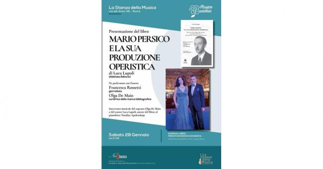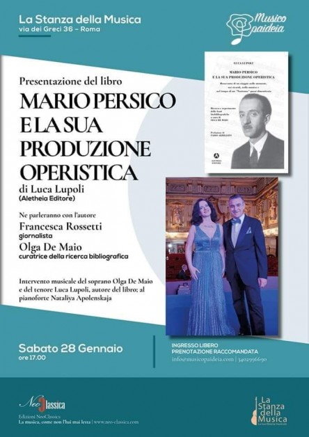 Sabato 28 gennaio 2023 alle ore 17.00 presso La Stanza della Musica, in Via dei Greci 36 ( nei pressi del Conservatorio di S.Cecilia)a Roma si terrà la presentazione del libro “ MARIO PERSICO E LA SUA PRODUZIONE OPERISTICA” Resoconto di un viaggio nelle memorie, nei ricordi, nella musica e nel tempo di un “Nostrano” quasi dimenticato, curata dall' Associazione Culturale Musicopaideia che ringraziamo.