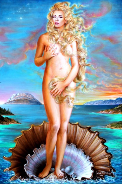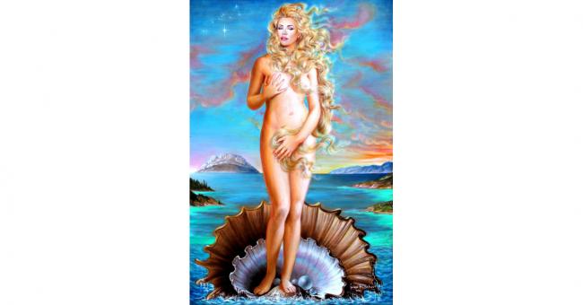 “La Nascita di Venere” di Ilian Rachov 150x100 cm, commissionata da un misterioso committente dal Medio Oriente, rappresenta un'interpretazione moderna del capolavoro di Sandro Botticelli conservato nella Galleria degli Uffizi.