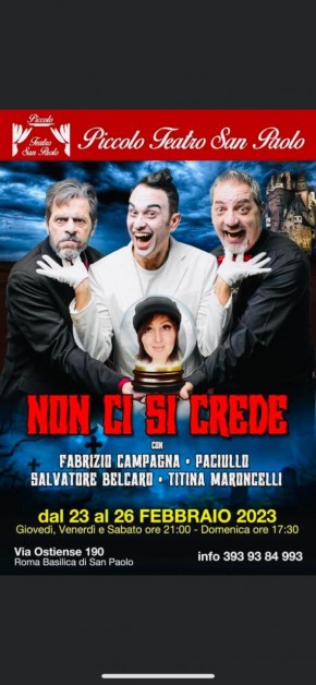 Appuntamento a teatro imperdibile! Al Piccolo Teatro San Paolo in Via Ostiense 190 Roma Basilica di San Paolo, c'è lo spettacolo " Non ci si crede" con Fabrizio Campagna, Paciullo, Salvatore Belcaro, Titina Maroncelli dal 23 al 26 Febbraio 2023.