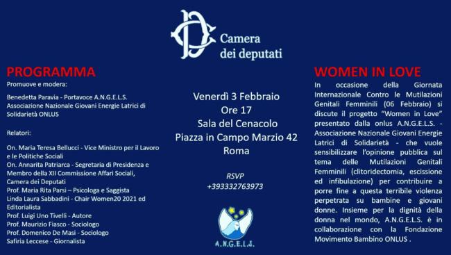 In occasione della Giornata Internazionale Contro le Mutilazioni Genitali Femminili - sancita dalle Nazioni Unite il 6 febbraio - venerdì 3 febbraio, alle ore 17, presso la Sala del Cenacolo della Camera dei Deputati (Piazza in Campo Marzio, 42) A.N.G.E.L.S. - Associazione Nazionale Giovani Energie Latrici di Solidarietà Onlus discuterà il progetto artistico, culturale ed umanitario "Women in Love" (presentato a Venezia lo scorso dicembre), il cui ricavato sarà impiegato per operare gratuitamente le vittime di infibulazione per il ripristino dello status quo, con il patrocinio del Ministero della Cultura, del Dipartimento per le Pari Opportunità e della Città di Venezia.