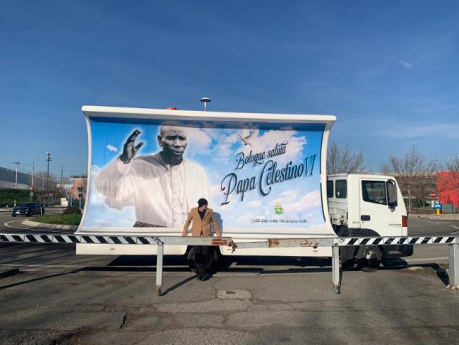 Un viaggio artistico che lancia un messaggio con l’innovativo stile di Pep Marchegiani. Il futuribile papa nero Celestino VI arriva a Bologna e per mostrarsi alla città si muove su alcuni camion vela tipicamente usati per le campagne pubblicitarie.