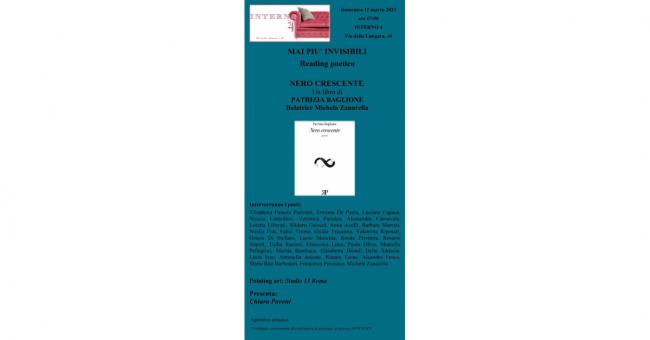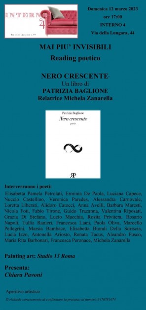 Domenica 12 marzo alle ore 17 a Interno 4 in via della Lungara 44 a Roma il reading poetico “Mai più invisibili” e la presentazione della raccolta di poesie “Nero crescente” di Patrizia Baglione, edito da RP Libri. Relatrice Michela Zanarella. Nella poesia di Patrizia Baglione un alone sottile di amore e di morte attraversa ogni singola poesia, finanche la più speranzosa e primigenia. “Questa raccolta, la terza dell’autrice, dal titolo Nero crescente, si può infatti definire come un autentico canzoniere ininterrotto che viaggia tra i due poli estremi del sentimento e della fine restando sempre sospeso in quel bilico verticale che la poetessa laziale sembra padroneggiare con umile e personalissima cadenza. E se “l’altro”, quell’amore abbandonato e impossibile, sembra a volte prendere il sopravvento quasi tormentando l’animo più elevato e primordiale, un sentimento più oscuro pervade l’intera raccolta, quasi a celare una pulsione verso la morte che pare intendere che la vita sia un continuo e perenne lutto sul quale riflettere e nella quale riflettersi fino a che un volto misterioso torni a dire cos’è che si ama e si teme. […] “. dall’introduzione di Antonio Bux.