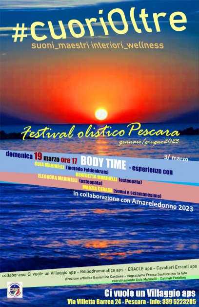 Domenica 19 marzo dalle 17 a Ci vuole un villaggio aps (Via Villetta Barrea 24 a Pescara) secondo appuntamento con il Festival olistico Pescara “#CuoriOltre – suoni, maestri interiori, wellness” che andrà avanti fino a giugno proponendo incontri esperienziali con le discipline del nuovo benessere. Evento organizzato in collaborazione con Ci vuole un Villaggio aps, Bibliodrammatica aps, Eracle aps, Cavalieri Erranti T.F. aps e con il patrocinio morale dello CSEN-Centro Sportivo Educativo Nazionale. Direzione artistica Beniamino Cardines, coordinamento Guia Marinelli e Carmen Padalino.