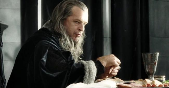 Dominato da un orgoglio smisurato, Denethor disprezza lo Hobbit che lo avverte di come suo figlio Faramir non sia morto, nonostante le apparenze da cadavere. Niente da fare: il sovrintendente di Gondor sale sulla pira preparata per il giovane e si dà fuoco. Accorgendosi solo all’ultimo, con orrore, che il figlio è ancora vivo, il castaldo si getta, in fiamme, dai bastioni del suo castello e si schianta al suolo.