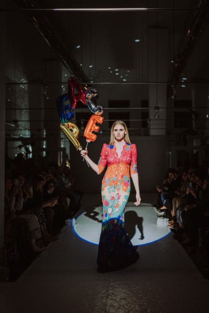 Il defilé inizia con un vero e proprio invito alla pace, vedendo sfilare in passerella un abito a sirena realizzato interamente con pizzi incastrati a mano artigianalmente, miscelando i vari colori dell’arcobaleno, una reinterpretazione originalissima che già anticipa quello che sarà il valore della sfilata, che si è, di fatto, articolata in 3 momenti ricchi di sorprese, di capi che si trasformano e che nascondono nuove forme funzionali al contenuto semantico che il creativo vuole trasmettere.