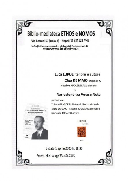 Sabato 1 aprile 2023, alle ore 18, 30 presso la biblio-mediateca “Ethos e Nomos” - via Bernini , 50 Napoli - si terrà la presentazione del libro “ MARIO PERSICO E LA SUA PRODUZIONE OPERISTICA” - Resoconto di un viaggio nelle memorie, nei ricordi, nella musica e nel tempo di un artista “Nostrano”. E’ storia recente che grazie al saggio di Luca Lupoli, il compositore ha avuto un suo posto nella prestigiosa Biblioteca del Conservatorio San Pietro a Majella, così come è giusto che fosse. L’autore, Luca Lupoli, dopo aver superato l’ostacolo della reperibilità bibliografica, grazie alla ricerca delle fonti a cura di Olga De Maio e grazie ad un incontro fortuito con il nipote dell’autore, il signor Sergio Nuvola, riesce a ricostruire la vita e l’opera di Mario Persico, uno di quegli autori dimenticati e ritrovati del nostro vasto patrimonio musicale. La puntuale e attenta prefazione di Fabio Armiliato, uno dei tenori italiani più importanti della scena lirica internazionale, ci introduce nella produzione operistica italiana a cavallo del 1800/1900 che è stata di una ricchezza inestimabile. Mario Persico è diventato famoso per aver musicato la commedia di Carlo Goldoni “La Locandiera”, e non solo. Interverranno la dott.ssa Tiziana Grande, responsabile della Biblioteca del Conservatorio di Musica San Pietro a Majella, il M° Rosario Ruggiero, giornalista ; Olga De Maio, Ricerche biobibliografiche; Luca Lupoli, Autore; Giancarlo Lobasso, attore ; a moderare Laura Bufano, giornalista. La presentazione si terrà in un luogo prezioso del Vomero “Ethos e Nomos” voluto da Giustino Gatti e Marisa Lembo che con tanta dedizione si adoperano a Divulgare la Cultura, Educare alla Bellezza e a Praticare il Rispetto nel pluralismo. Sarà una presentazione attraverso la voce, di Giancarlo Lobasso ad introdurre le note interpretate da Olga de Maio, soprano e da Luca Lupoli, tenore e autore del libro. Conosceremo Mario Persico, l’uomo e l’artista.