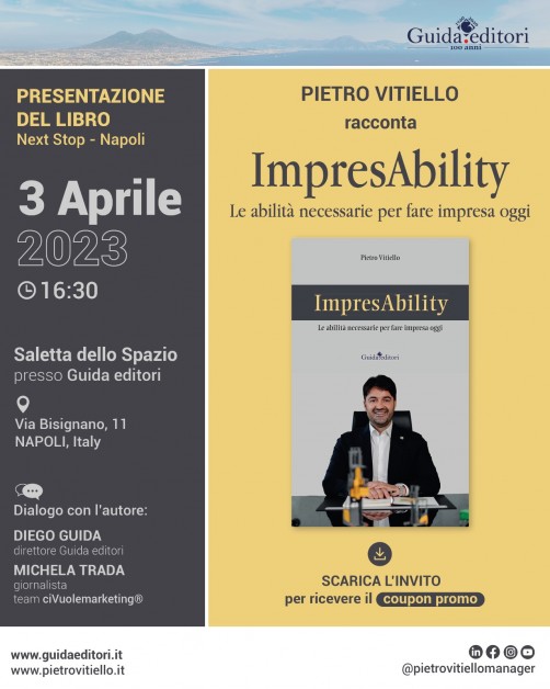 E’ possibile fare impresa oggi, in un contesto storico in cui mettersi in proprio rappresenta già di per sé un’impresa? E’ attuabile realizzare un’azienda creando benessere nel territorio in cui si vive? La risposta è “sì” e lo spiega Pietro Vitiello, ceo di Logcenter e già autore di “Impresa 4.0 Moving&Innovation”, nel suo secondo libro “ImpresAbility, le abilità necessarie per fare impresa oggi”, edito da Guida Editori che verrà presentato per la prima volta al pubblico “di casa” il prossimo 3 aprile alle 16.30 nella saletta dello Spazio presso Guida editori di via Bisignano 11, a Napoli.