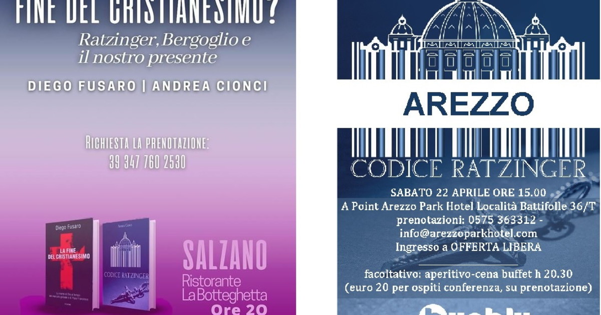 Noi faremo, comunque, il nostro dovere di informarvi. I prossimi appuntamenti con la conferenza su Codice Ratzinger e la sede impedita di papa Benedetto saranno a Salzano, il 14 aprile, insieme a Diego Fusaro che presenterà il suo libro “La fine del Cristianesimo”. Ad Arezzo, il 22 aprile; a Brescia il 13 maggio e il 19 a Trapani.