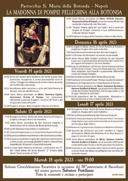 Dal 14 al 17 aprile prossimi si svolgerà l'evento Missione Mariana " La Madonna di Pompei Pellegrina alla Rotonda",presso la Chiesa di Santa Maria della Rotonda in via Pietro Castellino a Napoli,in cui sarà esposto alla devozione dei fedeli il quadro della Madonna di Pompei,articolato in varie celebrazioni liturgiche e di preghiera,voluto dal Parroco Don Salvatore Fratellanza che il 18 aprile celebrerà il suo cinquantesimo anniversario di sacerdozio.
