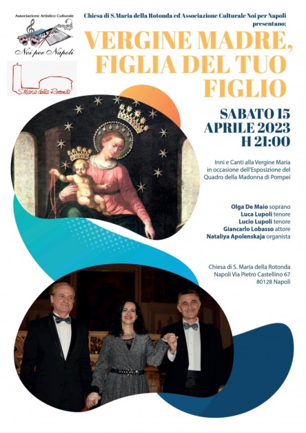 Sabato 15 aprile alle h. 21 vi sarà il Concerto dal titolo "Vergine Madre, figlia del tuo figlio" Inni e Canti alla Vergine Maria a cura dell' Associazione Artistico Culturale APS Noi per Napoli ed avrà come interpreti il soprano Olga De Maio, i tenori Luca Lupoli e Lucio Lupoli,l' attore Giancarlo Lobasso accompagnati da Nataliya Apolenskaya organista.