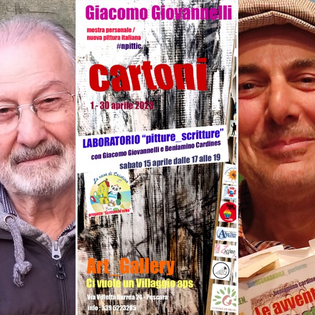 Sabato 15 aprile 2023 dalle 17 a Ci vuole un Villaggio - ArtGallery (Via Villetta Barrea 24 a Pescara), Giacomo Giovannelli (artista visivo pluripremiato) e Beniamino Cardines (vincitore Migliore Autore dell’Anno 2023, LFA Publisher Italia-Spagna) terranno un laboratorio di arte, linguaggi e disabilità, promosso dal centro diurno La Casa di Cristina ODV. “Cartoni Lab pitture_scritture” nel contesto della mostra personale dell’artista M° Giacomo Giovannelli “Cartoni – il materiale di recupero diventa arte” visitabile fino al 30 aprile 2023.
