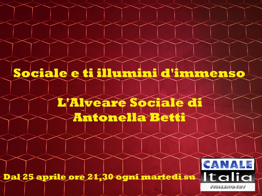 All’avvio fra pochi giorni del programma tv “Sociale e ti illumini d’immenso. L’Alveare Sociale di Antonella Betti“, con la Regia di Gennaro Ruggiero, Assistente alla Regia Angelica Loredana Anton dal 25 Aprile 2023 tutti i martedì alle ore 21,30 su Canale Italia Nazionale – DTT Italia 121. Registrato presso gli studi di Radio Planeta Factory – Roma, montaggio Laboratorio Cinema Tv – Roma.