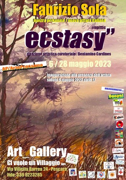 Sabato 6 maggio 2023 dalle 17 a Ci vuole un Villaggio - ArtGallery (Via Villetta Barrea 24 a Pescara) inaugurazione della mostra personale dell’artista Fabrizio Sola “Ecstasy” visitabile fino al 28 maggio 2023. Evento organizzato da AP/ArteProssima – pinacoteca d’arte contemporanea. Direzione artistica curatoriale Beniamino Cardines.